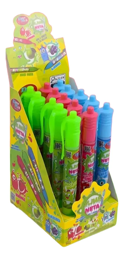 Diversão e sabor em um só produto! O kit Slime Neta da Doce Mix Candy vem com 15 balas líquidas em formato de caneta, com sabores artificiais de morango, maçã verde e blueberry (mirtilo). Ideal para festas, lembrancinhas, presentinhos ou simplesmente para saborear um doce diferente e divertido. A embalagem atrativa e colorida chama a atenção das crianças, enquanto o formato inovador em caneta facilita o consumo e garante a brincadeira.